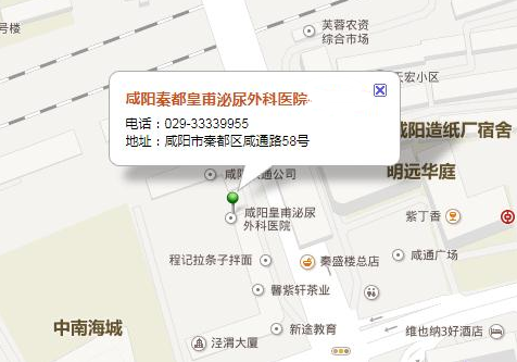 医院地址:咸阳市秦都区咸通路58号 地理位置优越,交通方便,市内乘坐1路、13路、20路公交 在防洪渠下车即到。 医院免费咨询电话:029-33339955 门诊时间:早8:00-晚20:00节假日不休